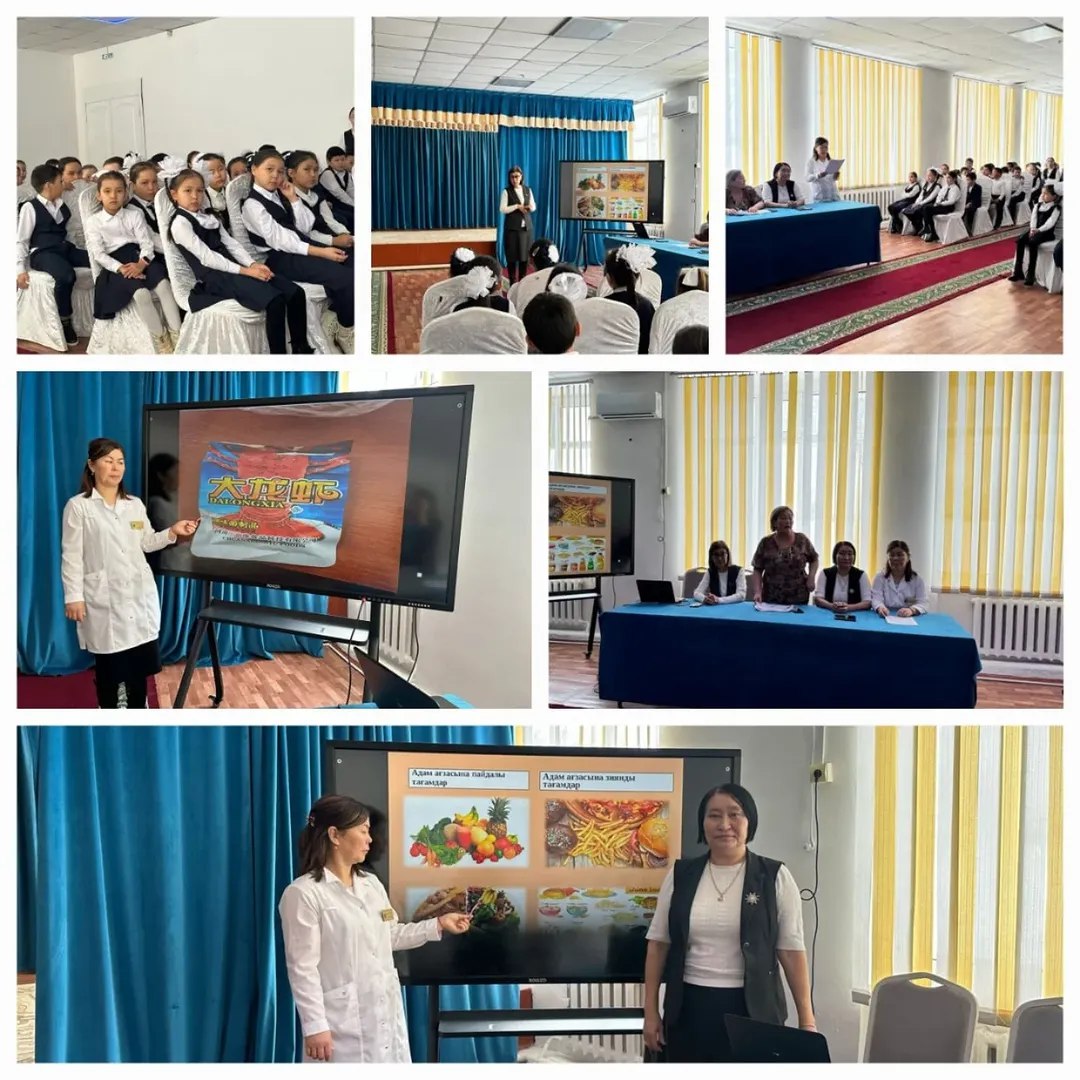 Балалар мен жасөспірімдерге дұрыс тамақтану олардың денсаулығын нығайтып, дене және ой қабілетінің дамуына мүмкіндік беретіндігін, еңбек ету мен сабаққа үлгеру қабілетін арттыратынын айтты. Тамақтану дұрыс ұйымдастырылмаса, тиімсіз, яғни жеткіліксіз болса, организмде метаболизм , зат алмасу бұзылып, оның айналадағы ортаның зиянды әсеріне әртүрлі жұқпалы ауруларға қарсы тұрарлық қабілеті төмендейтіні жайында және дүкендерден зиянды тағамдарды сатып алмау және пайдаланбау жайында түсіндіріліп, бейнероликтер көрсетілді. Аталған іс-шаралар жалғастырылып, тапсырманың орындалуы туралы ақпараттар өз мерзімінде жіберілетіндігі хабарланады.