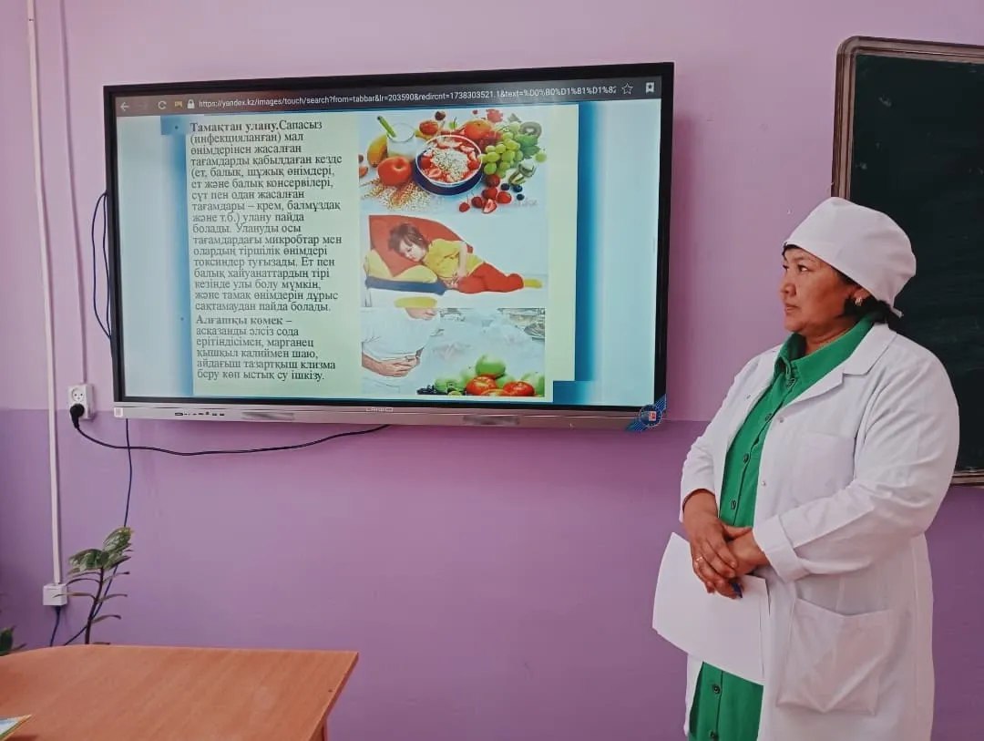 Сагинова Аклима Тобышқызы мен ДТІЖО Ботағарин Серік Нығметұлының қатысуымен тағамнан уланудың алдын алу мақсатында түсіндірме жұмыстары жүргізілді.
